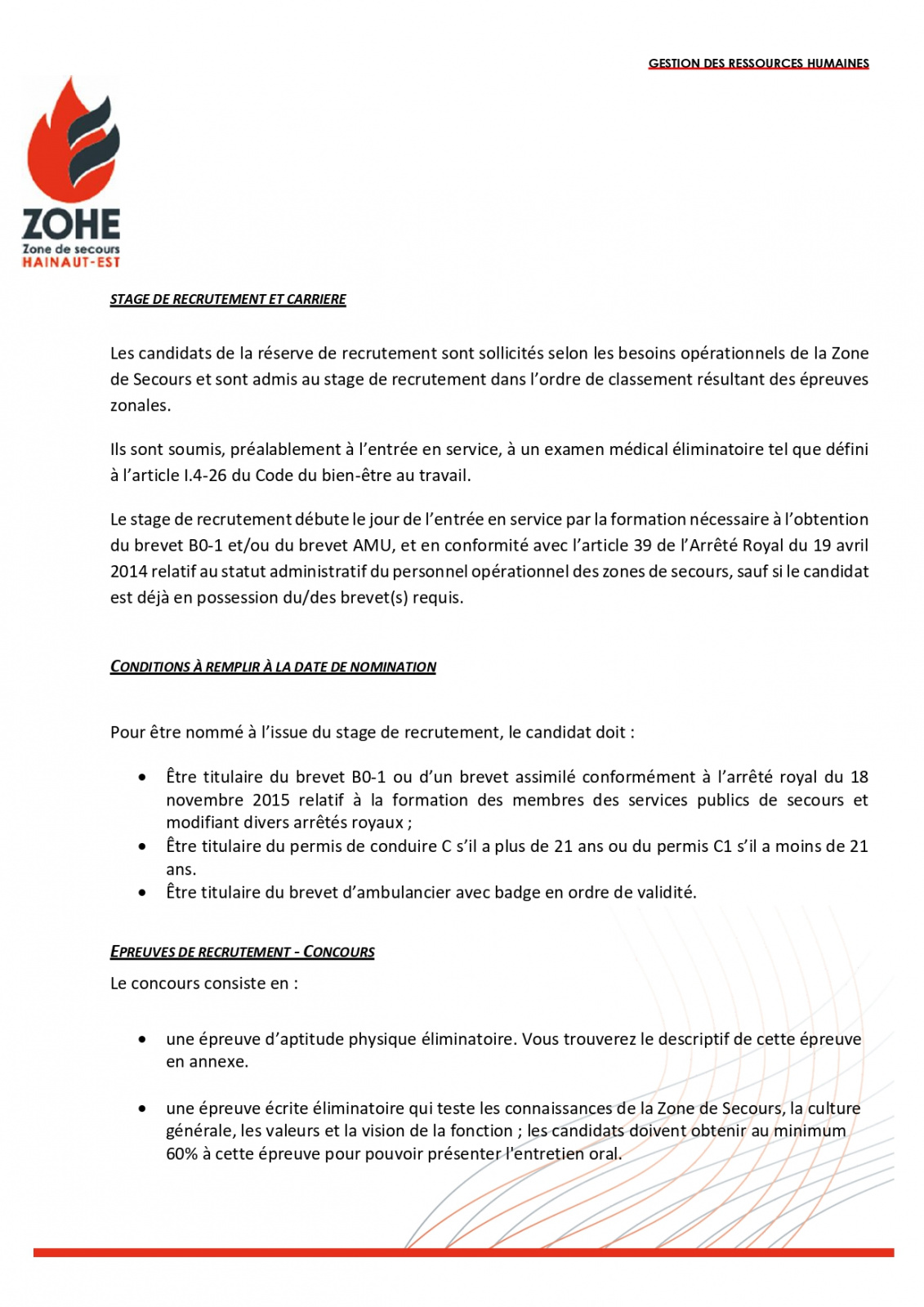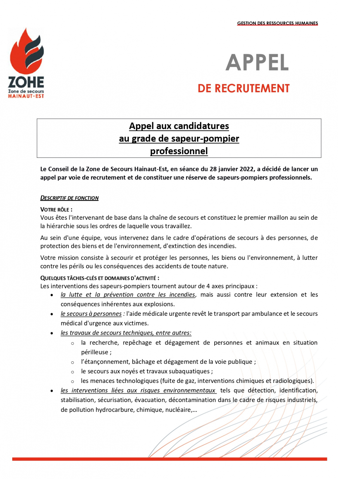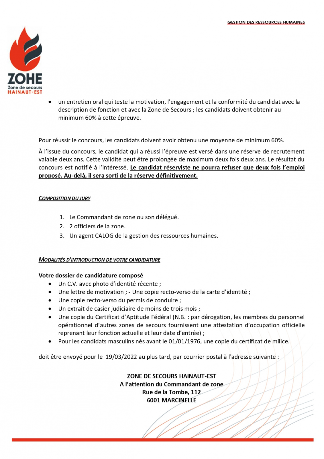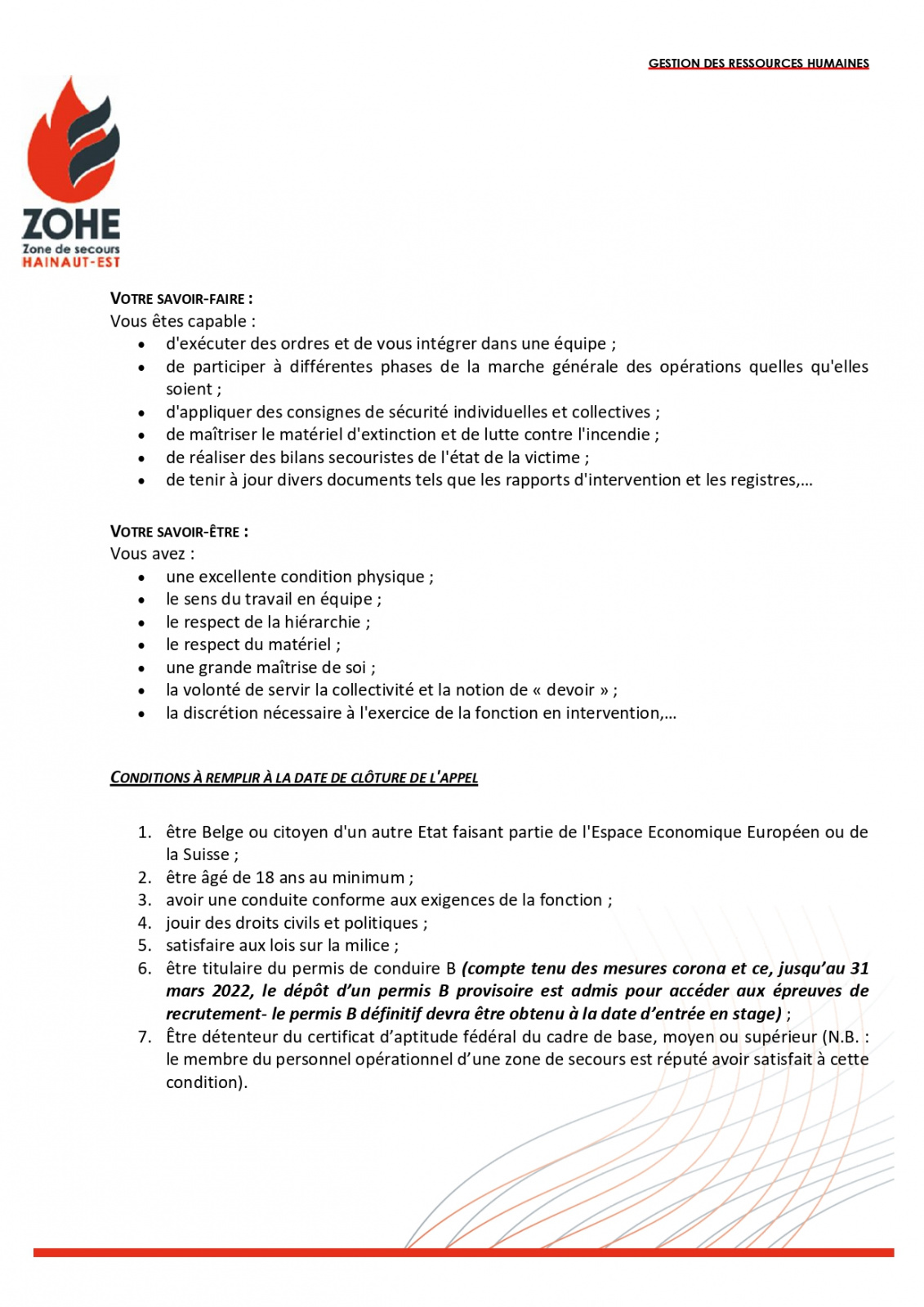 MISE A JOUR : la Zone de secours a reçu la confirmation qu’un Certificat d’Aptitude Fédérale (condition essentielle pour accéder à l’emploi de sapeur-pompier professionnel) serait bien organisé par l’Institut provincial de formation du Hainaut à partir du 16 mars. Dès lors, et pour s’assurer d’un vivier de candidatures le plus large possible, la détention du CAF ne sera plus demandée à la clôture de l’appel mais bien au plus tard à la date de l’organisation des épreuves d’aptitudes physiques liées à cet appel.