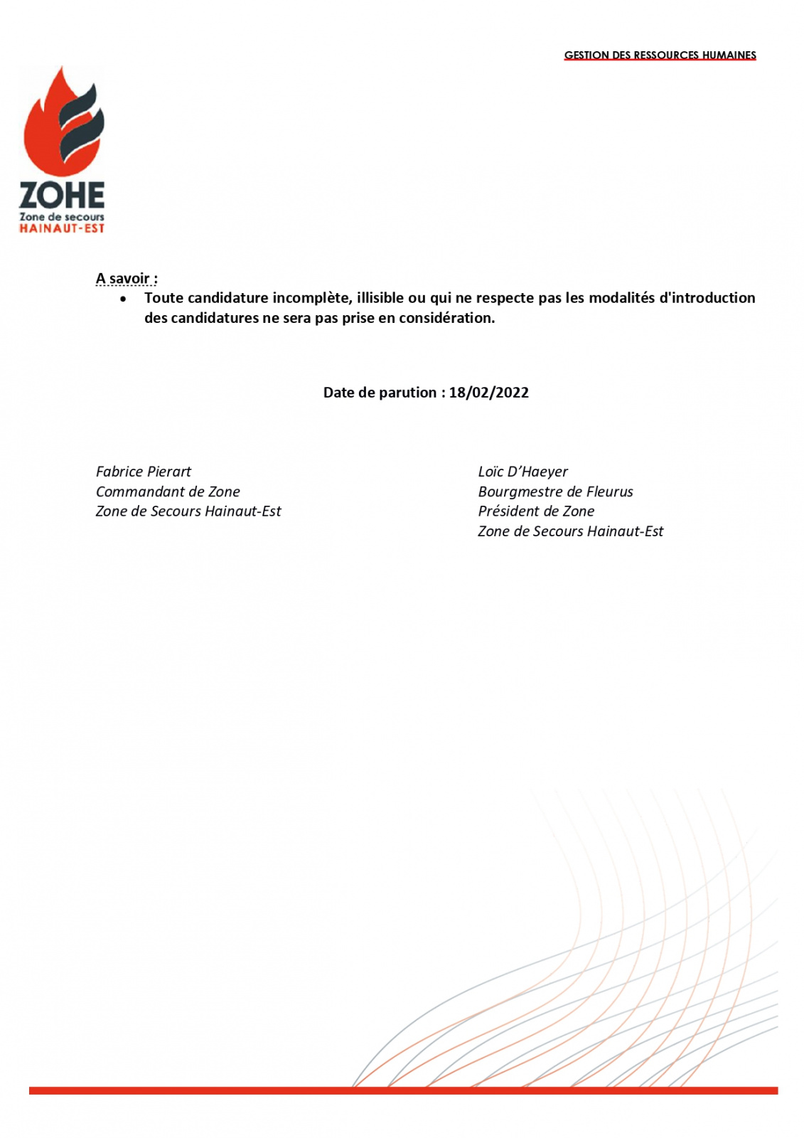 La Zone de secours Hainaut-Est nous demande de publier l'avis suivant :