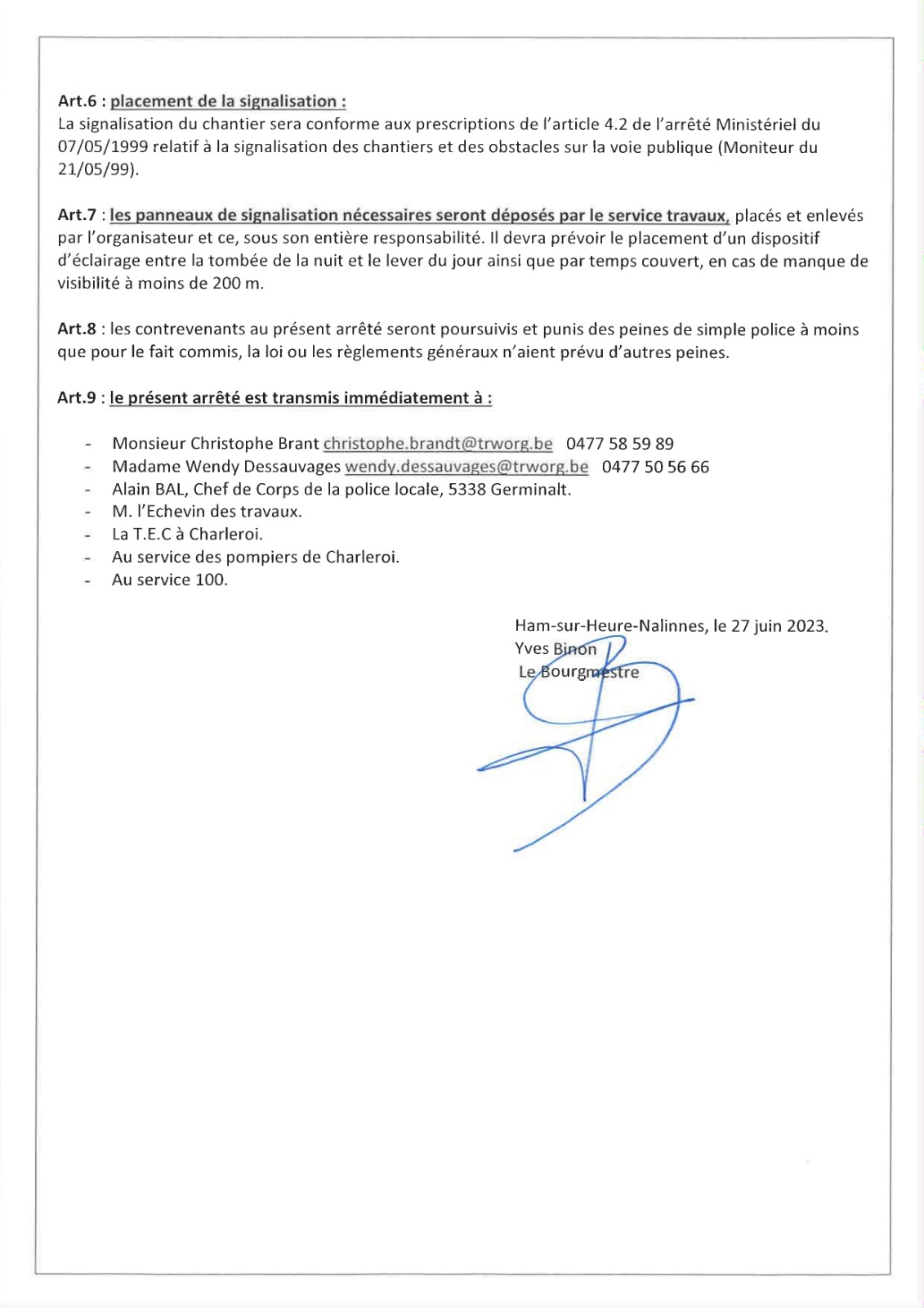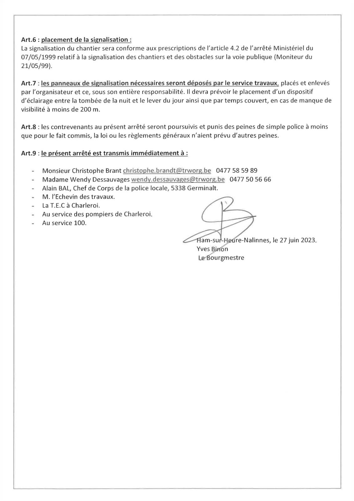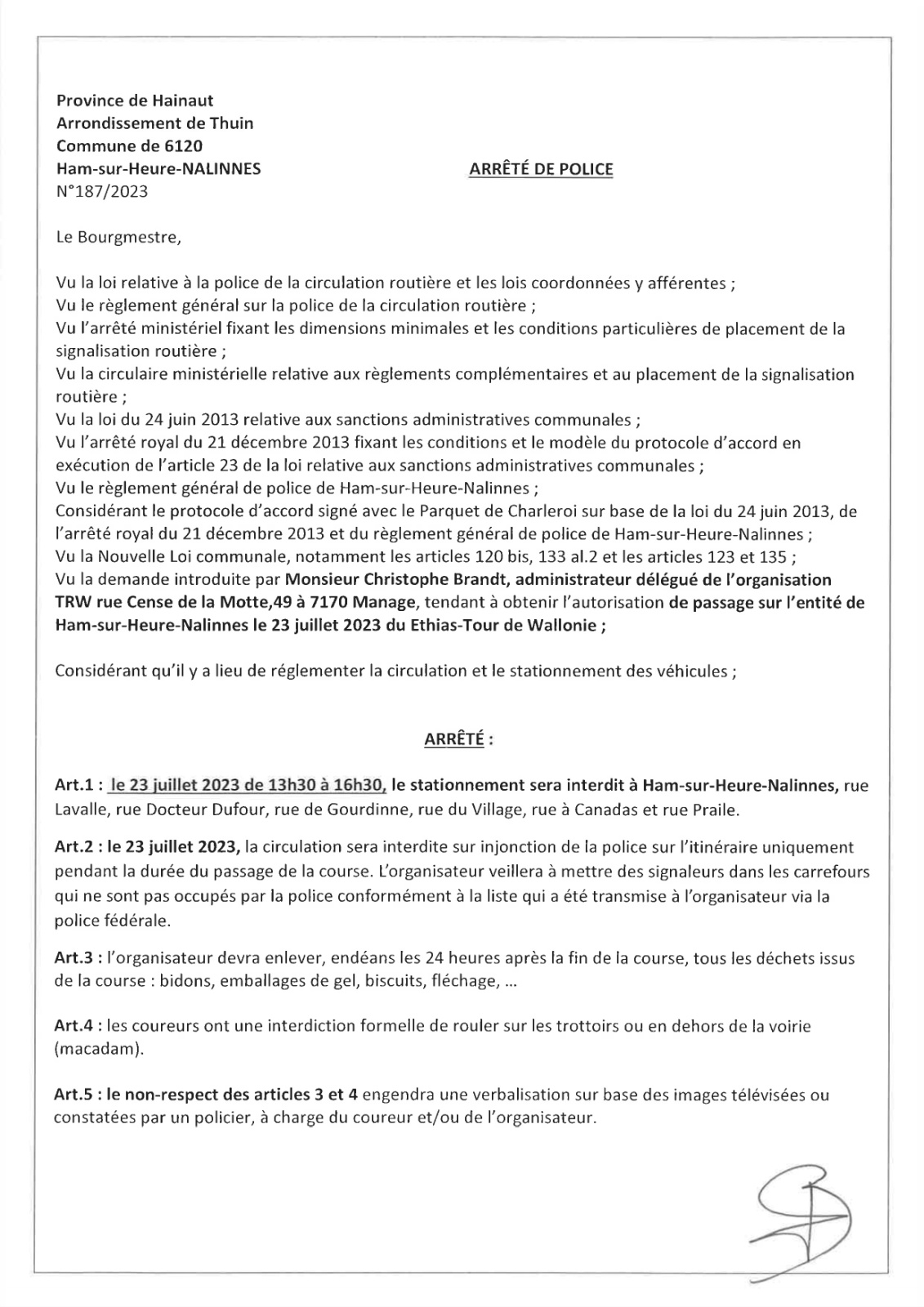 Arrêtés de police relatif au passage du Tour de Wallonie sur le territoire de notre Commune (à Nalinnes, Marbaix-la-Tour, Ham-sur-Heure et Cour-sur-Heure) ces 23 et 24 juillet