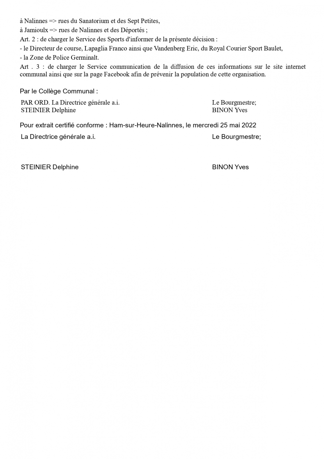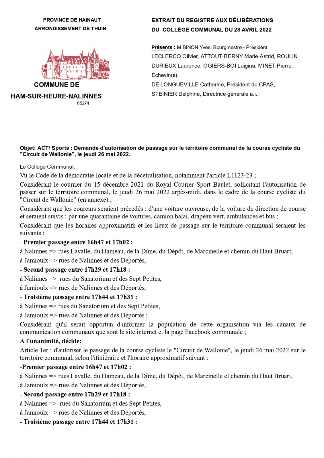 Voici la délibération qui autorise le Circuit de Wallonie à passer sur le territoire de la Commune :