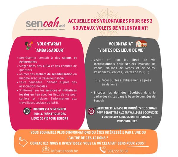 Pour toutes informations complémentaires, n'hésitez pas à contacter SENOAH au 081/22.85.98 ou par mail à .