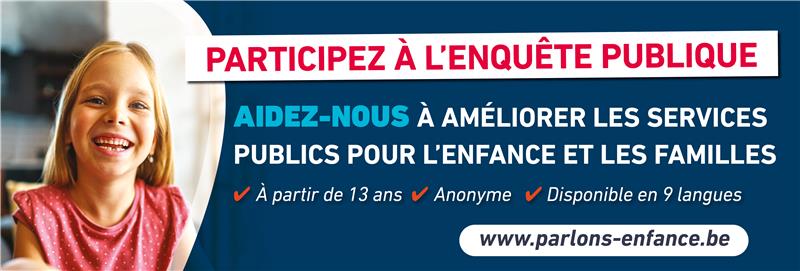Du 1er octobre au 3 novembre 2025, l’Office de la Naissance et de l’Enfance (ONE) organise “Parlons enfance”, une vaste enquête publique ouverte à toutes et tous dès 13 ans. Chacun est invité à s’exprimer librement sur ses besoins, ses préoccupations et ses espoirs pour l’enfance, l’adolescence et la parentalité.