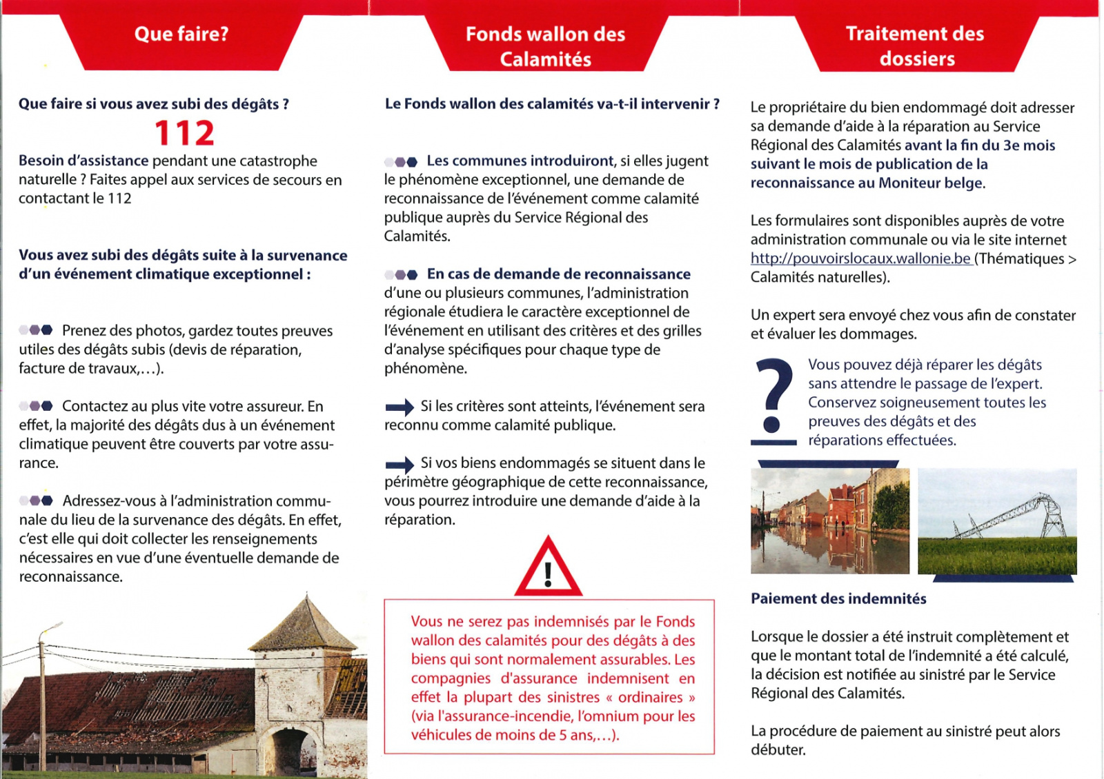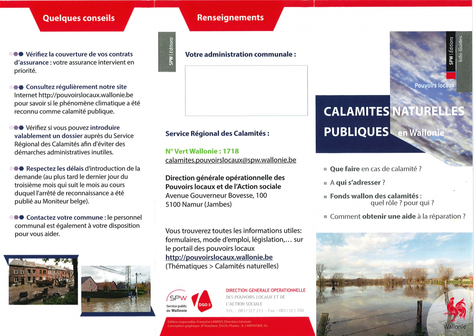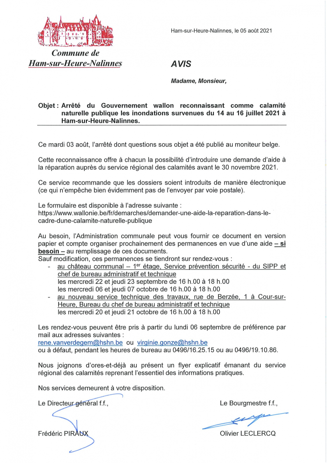 Suite à l'arrêté du Gouvernement wallon du 28 juillet 2021 reconnaissant comme calamité naturelle publique les inondations survenues du 14 au 16 juillet 2021 sur notre Commune, il vous est possible d'introduire un dossier au Fonds des Calamités afin, le cas échéant, de recevoir une indemnisation. Ce dossier doit être introduit avant le 30 novembre 2021.