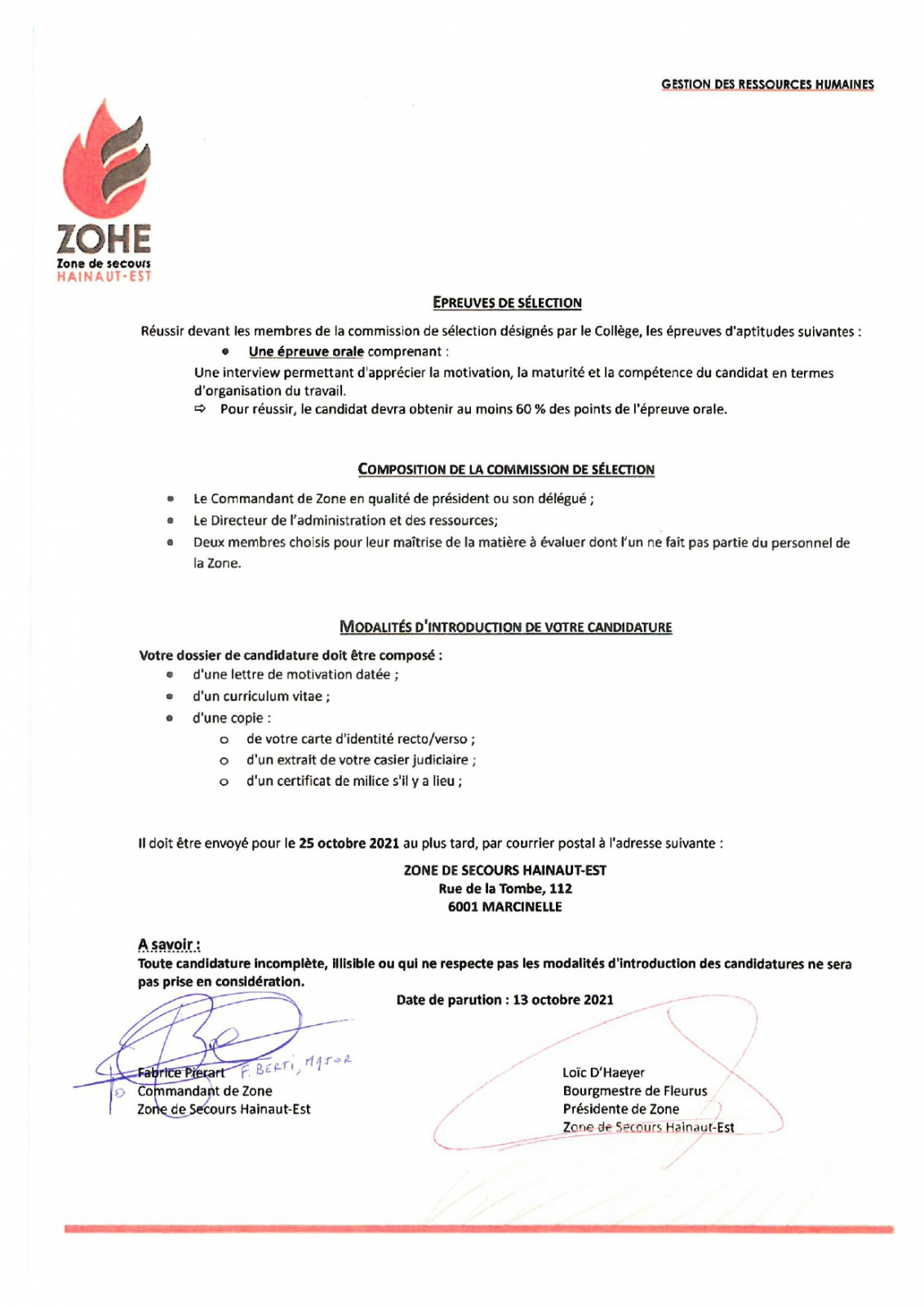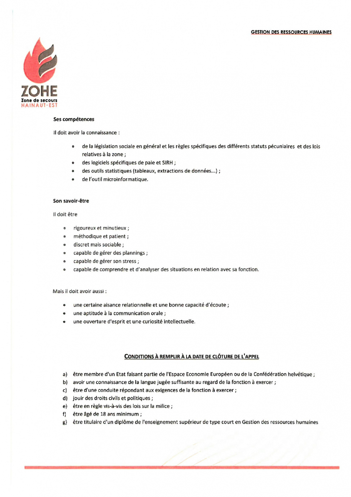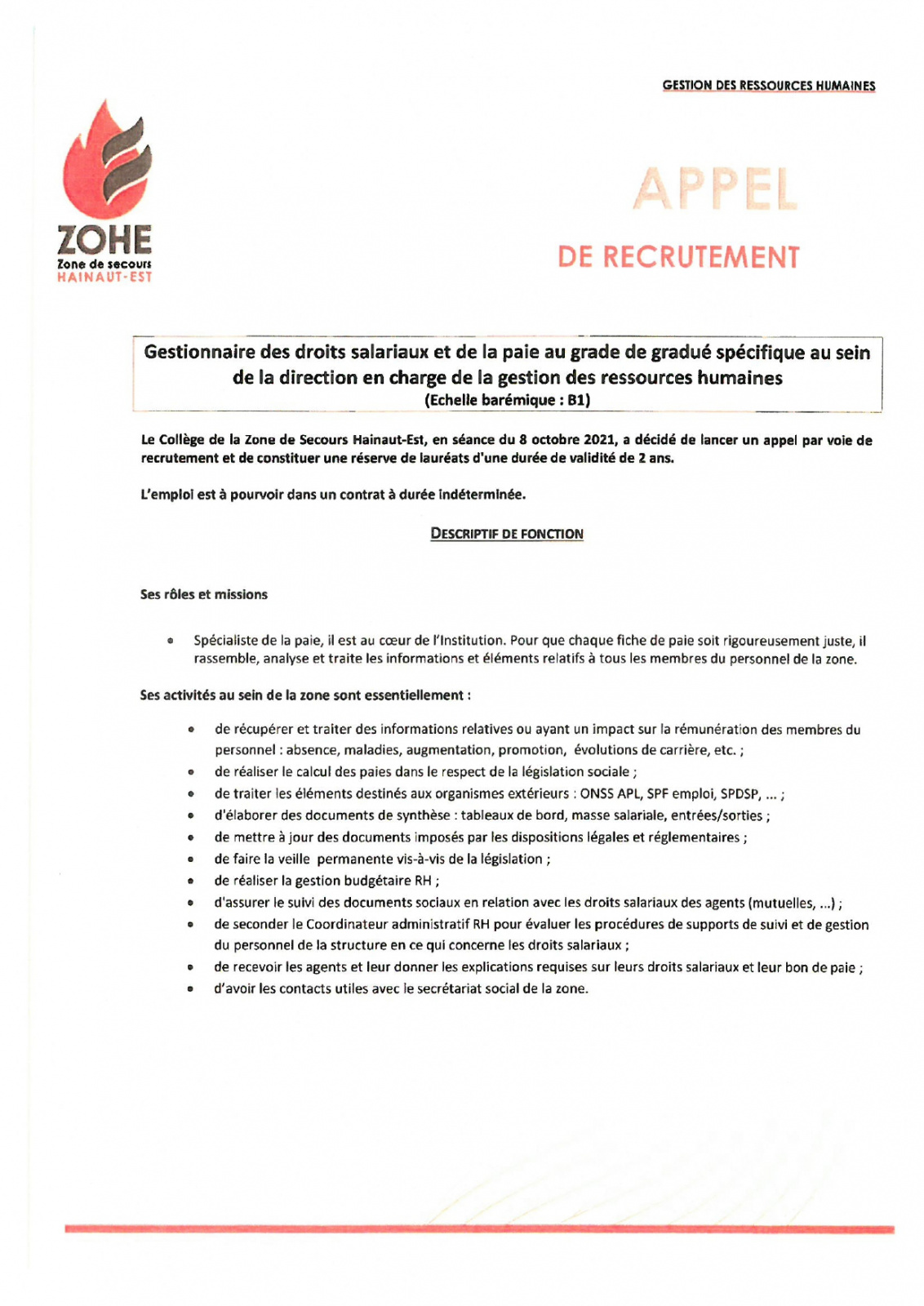 Zone de Secours Hainaut-Est : appel de recrutement - gestionnaire de droits sallariaux et de la paie