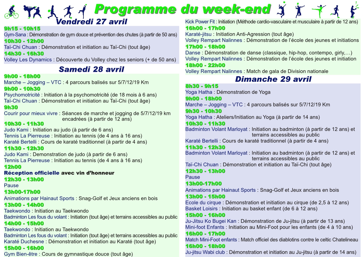 Lors de cet évènement, les clubs sportifs qui occupent le Centre vous proposeront soit une initiation, soit une démonstration de leur discipline. Le programme complet se trouve ci-dessous.