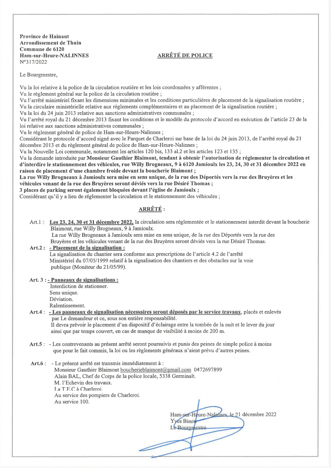 Arrêté de police réglementant la circulation à la rue Willy Brogneaux à Jamioulx