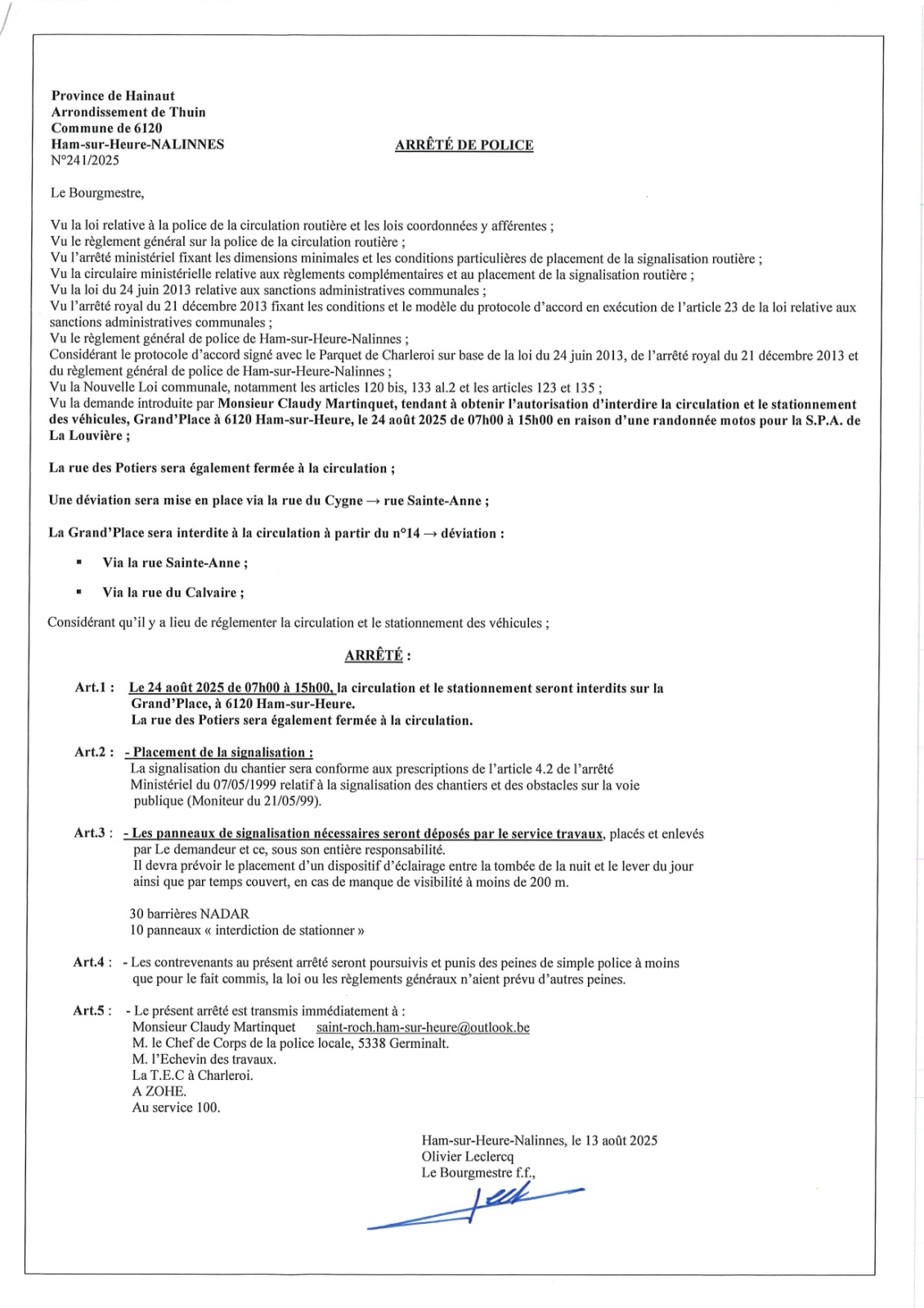 Arrêté de police relatif à la balade moto du 24 août 2025 à Ham-sur-Heure