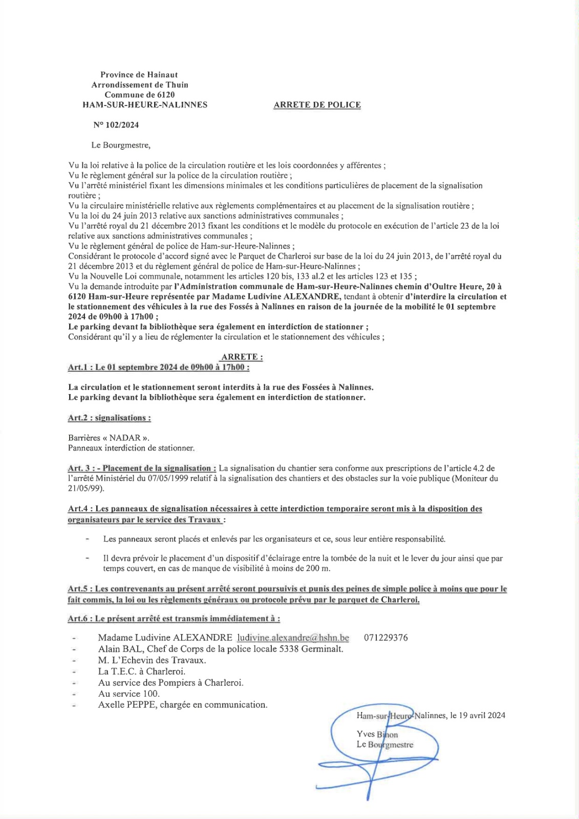 Arrêté de police relatif à la Journée de la Mobilité du dimanche 1er septembre à Nalinnes