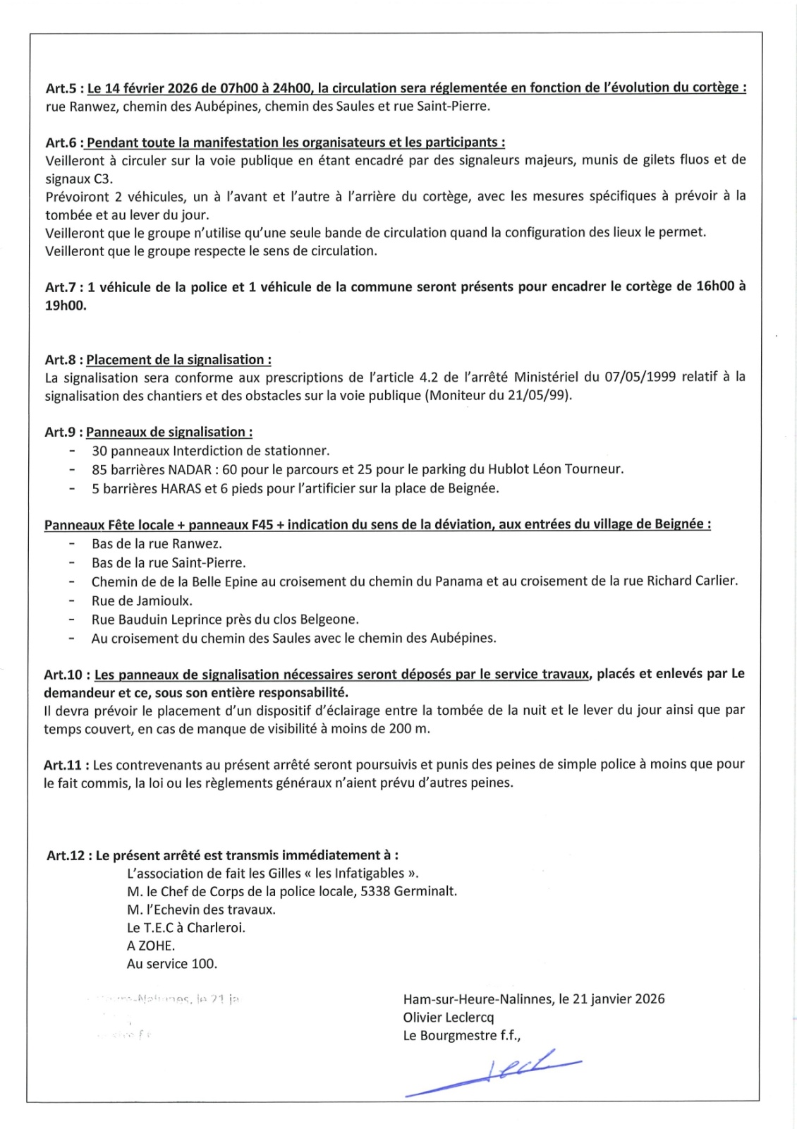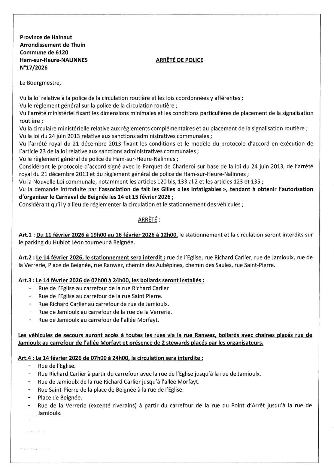 Arrêté de police relatif au Carnaval de Beignée (14 février 2026)
