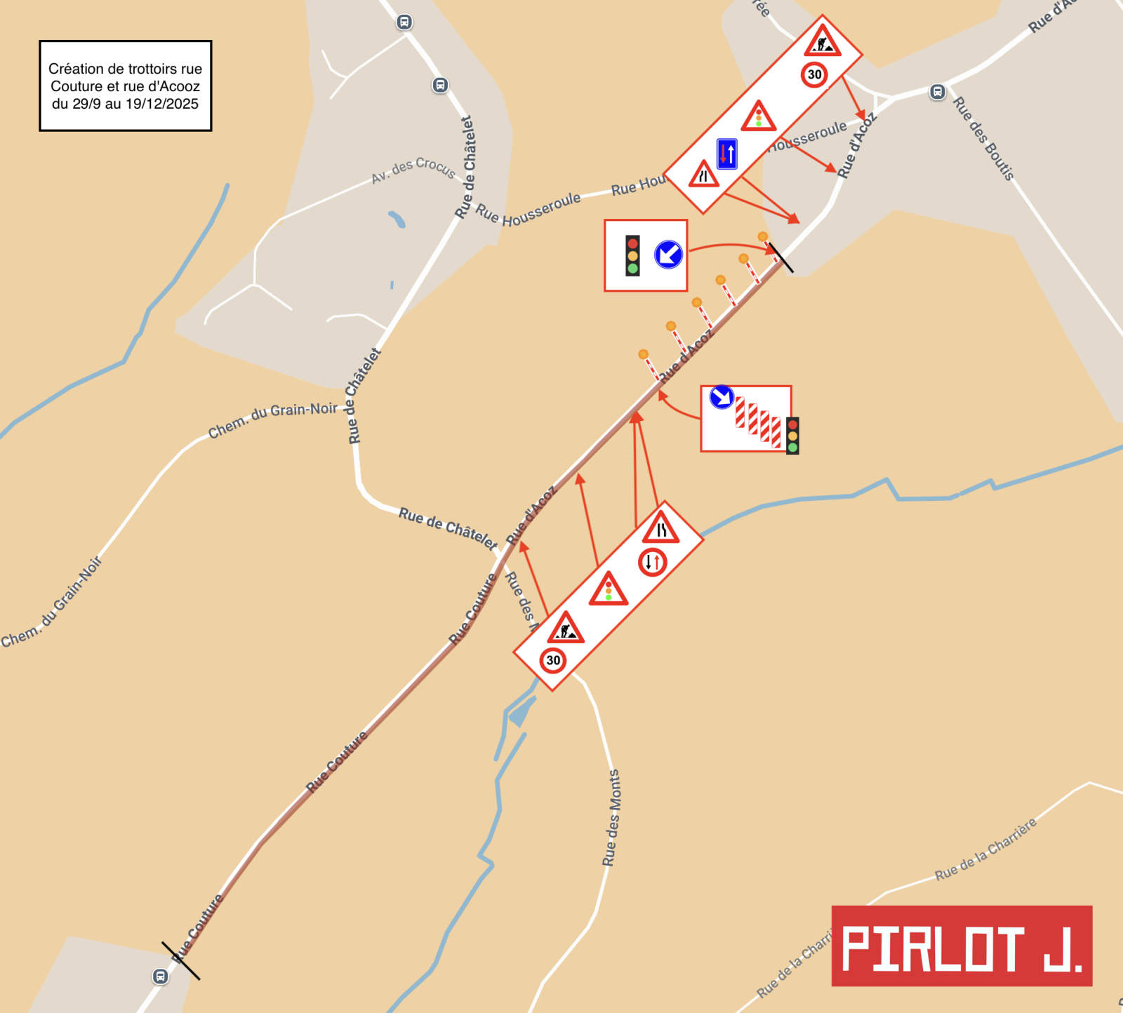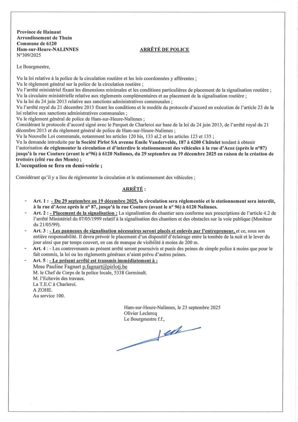 Arrêté de police relatif au chantier de création d'un trottoir rue d'Acoz et rue Couture à Nalinnes