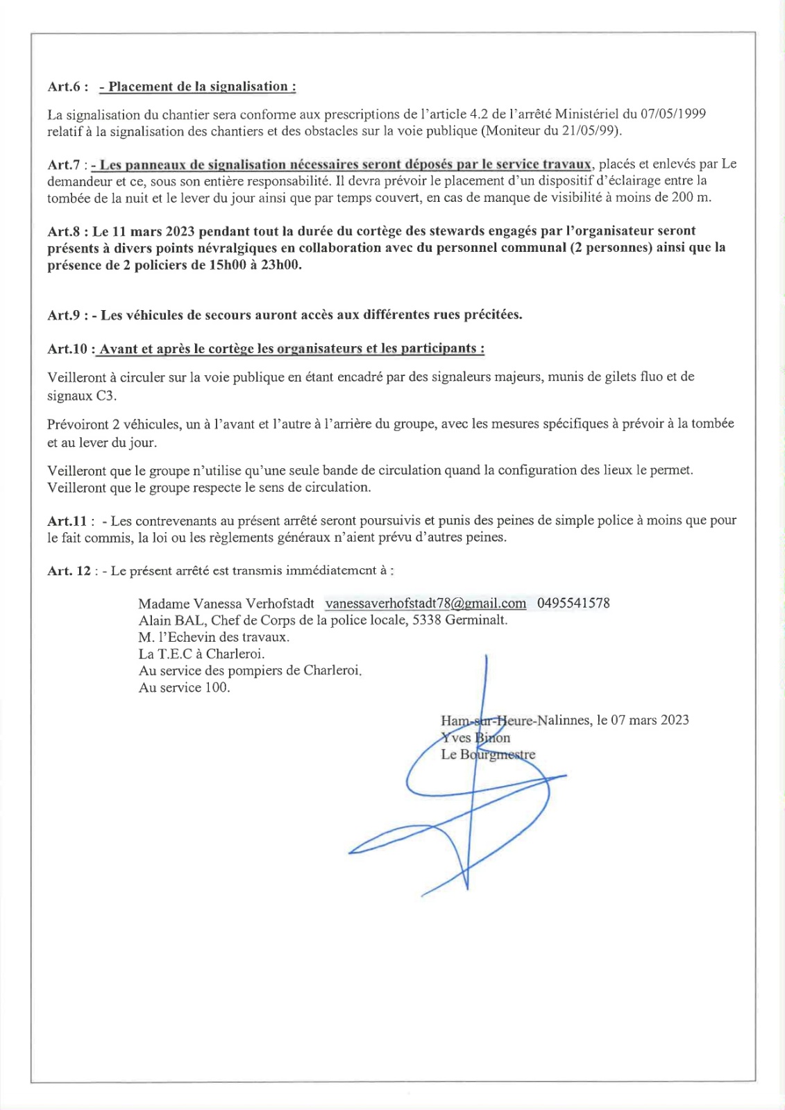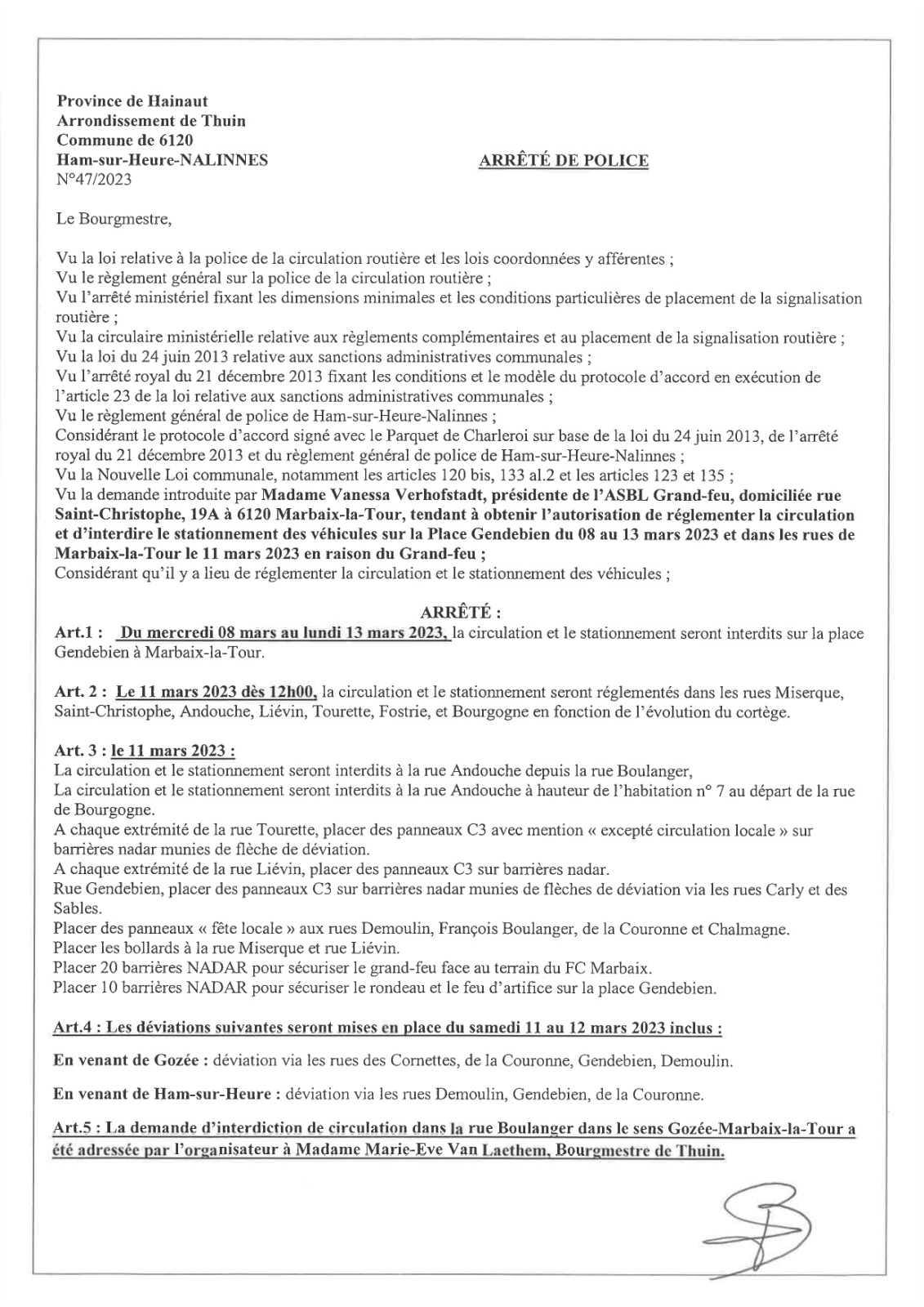 Arrêté de police relatif au Grand Feu de Marbaix-la-Tour