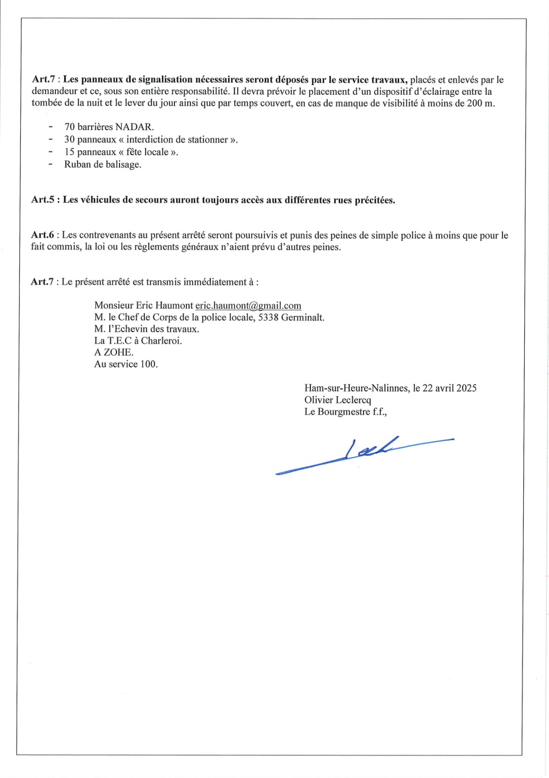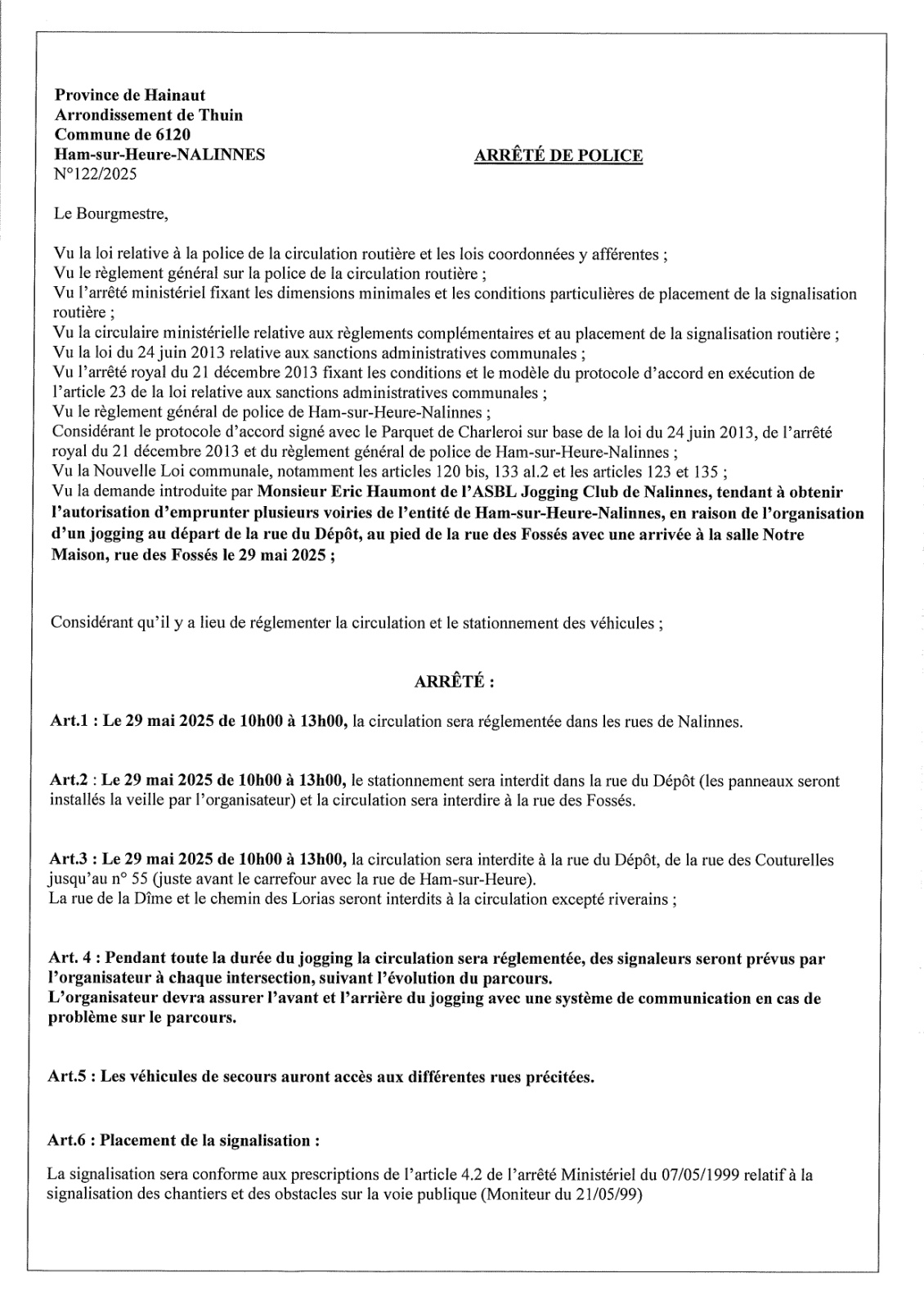 Arrêté de police relatif au jogging du club de Nalinnes de ce jeudi 29 mai 2025