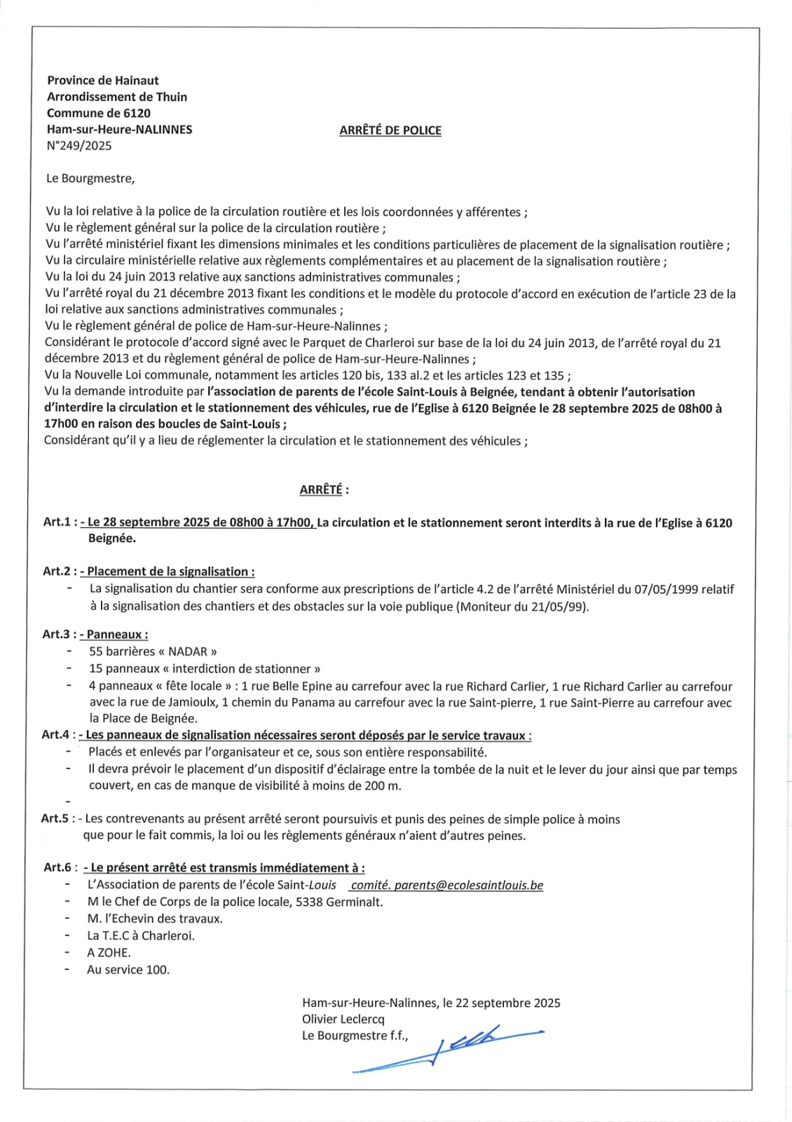 Arrêté de police relatif aux Boucles de Saint-Louis le dimanche 28 septembre à Beignée