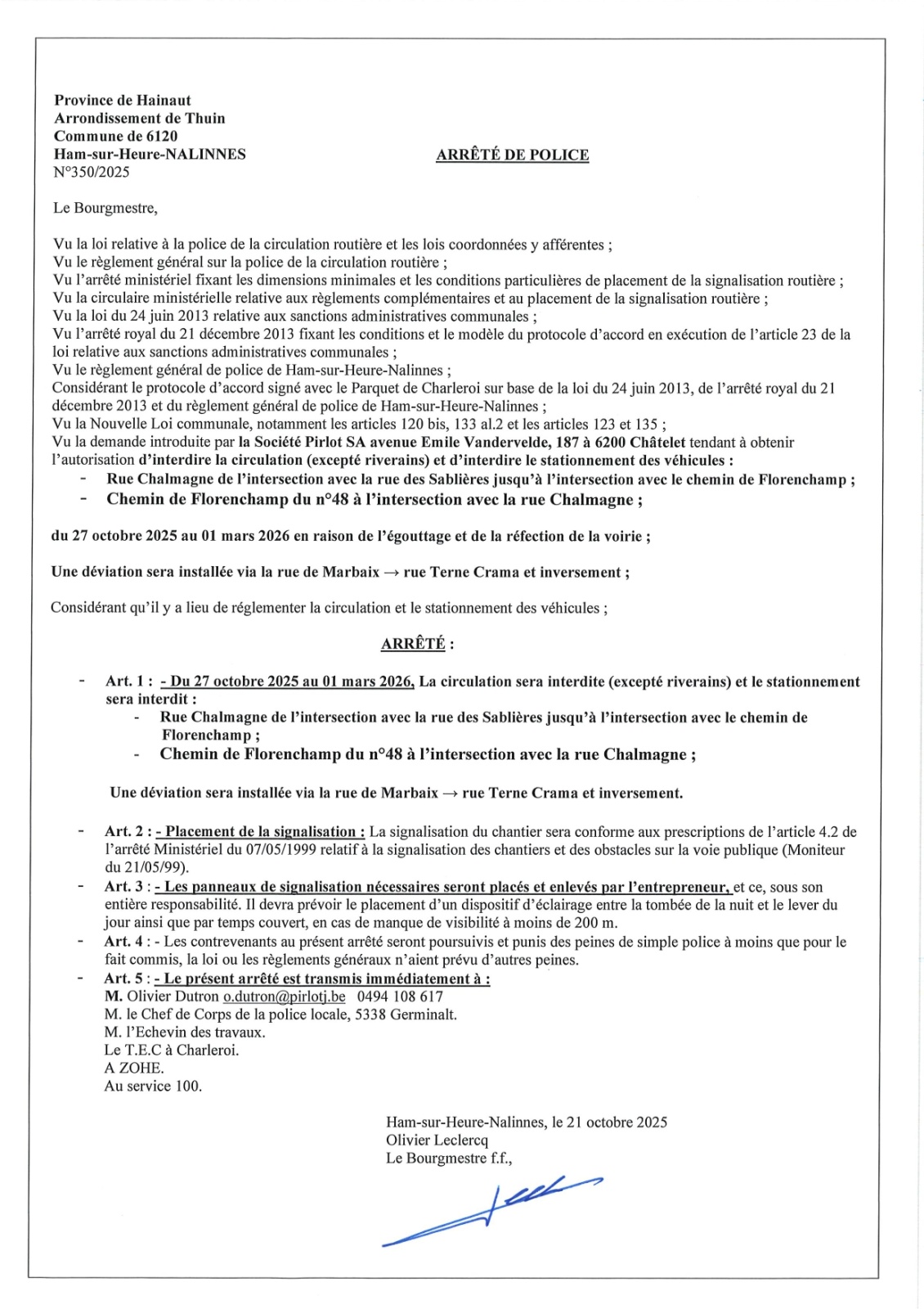 Arrêté de police relatif aux travaux à la rue Chalmagne / chemin de Florenchamp