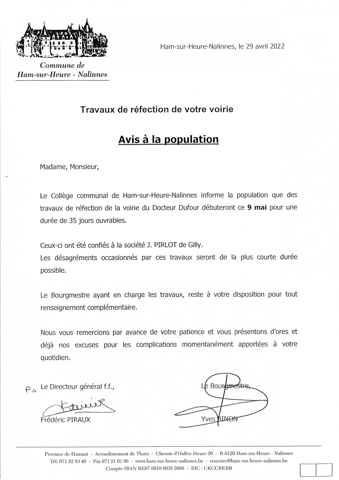 Avis à la population : Les travaux de réfection vont commencer à la rue Docteur DUFOUR à Nalinnes