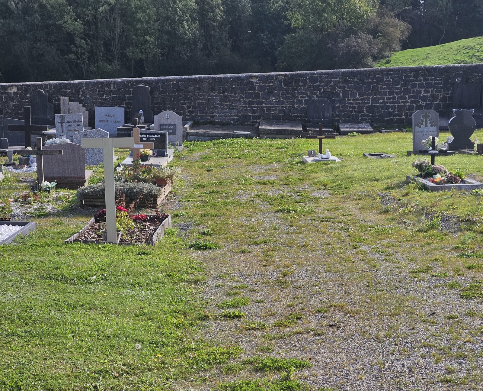 Les allées et les entre-tombes de ce cimetière sont maintenant végétalisées offrant à ce lieu un tapis de verdure.