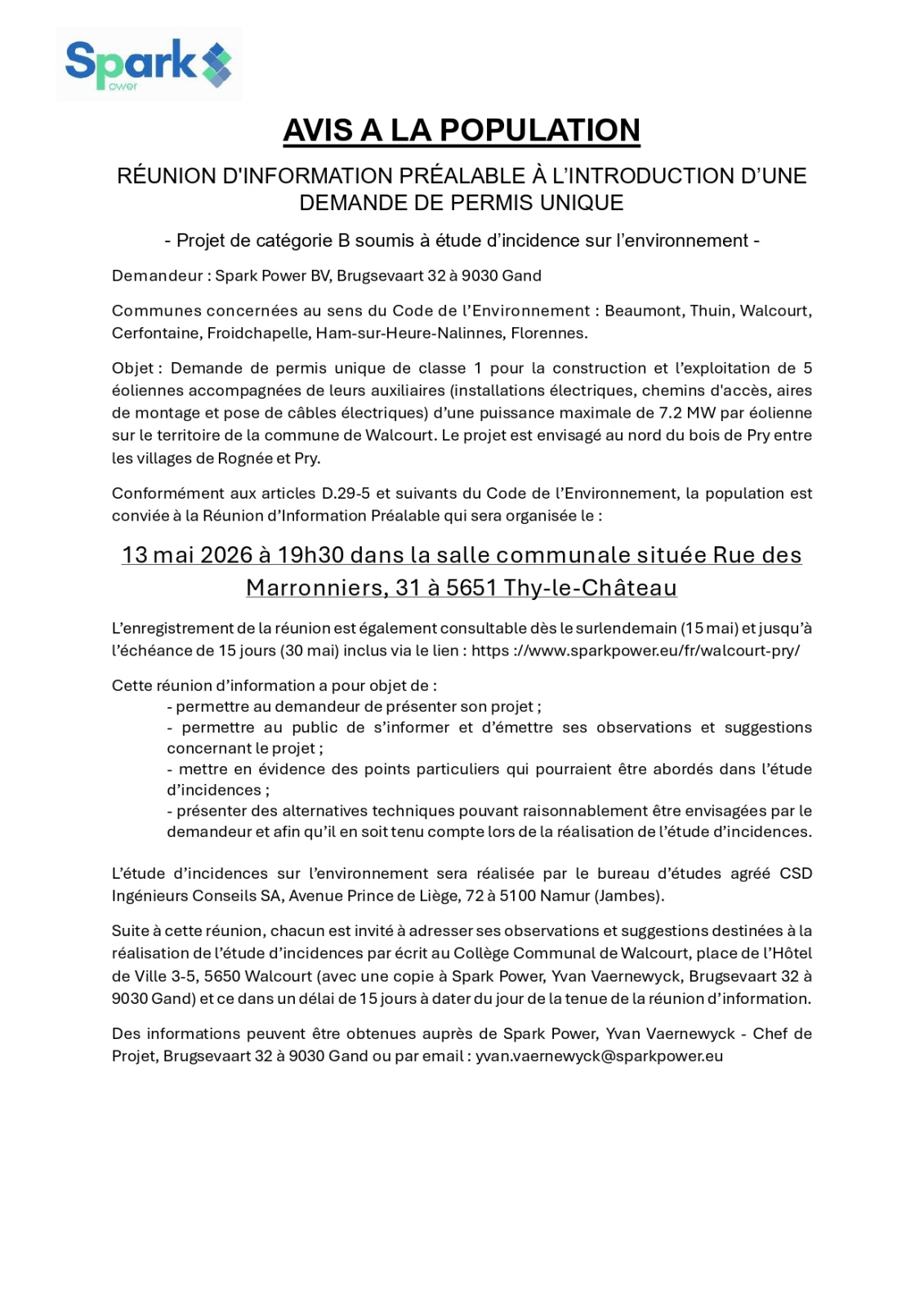 Invitation à la réunion d'information préalable à l'introduction d'une demande de permis unique relatif à la construction et l'exploitation de 5 éoliennes sur la Commune de Walcourt