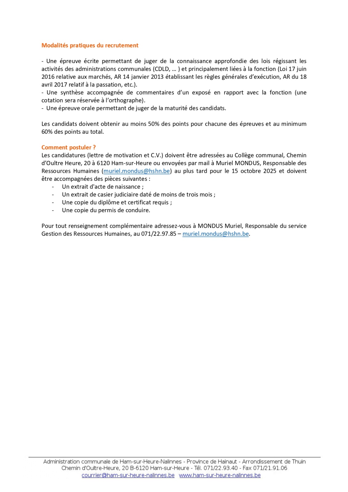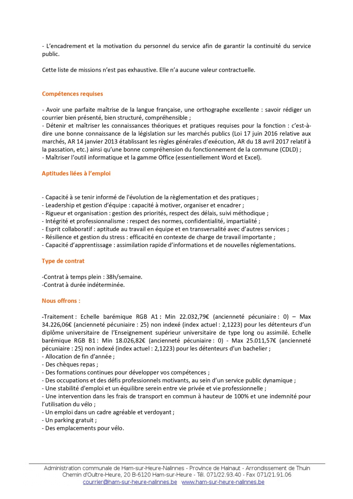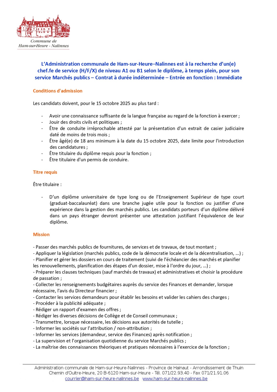 L’Administration communale de Ham-sur-Heure–Nalinnes est à la recherche d’un(e) chef.fe de service (H/F/X) de niveau A1 ou B1 selon le diplôme, à temps plein, pour son service Marchés publics – Contrat à durée indéterminée – Entrée en fonction : Immédiate