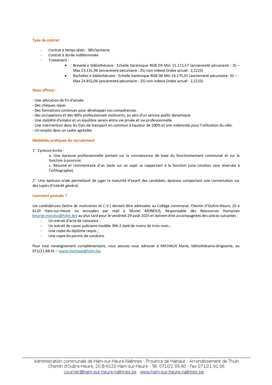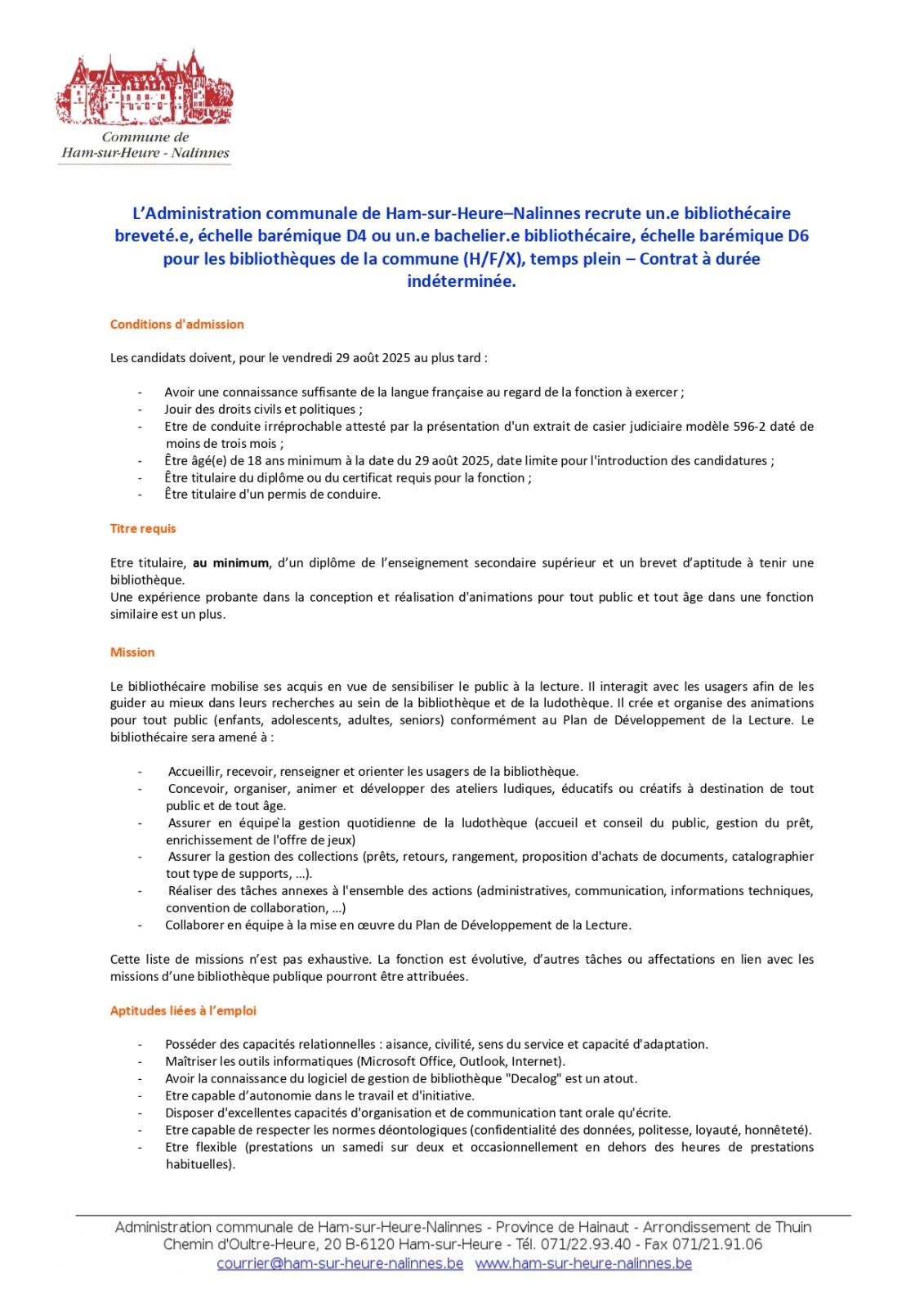L’Administration communale de Ham-sur-Heure–Nalinnes recrute un.e bibliothécaire breveté.e, échelle barémique D4 ou un.e bachelier.e bibliothécaire, échelle barémique D6 pour les bibliothèques de la commune, temps plein – Contrat à durée indéterminée