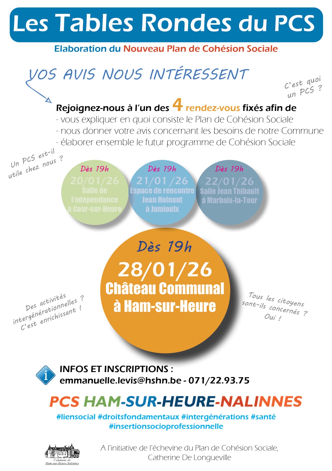 Un seul rendez-vous, un moment convivial pour nous donner vos idées et suggestions pour un Plan de Cohésion Sociale efficace et adapté à notre Commune et pour y poser toutes vos questions !