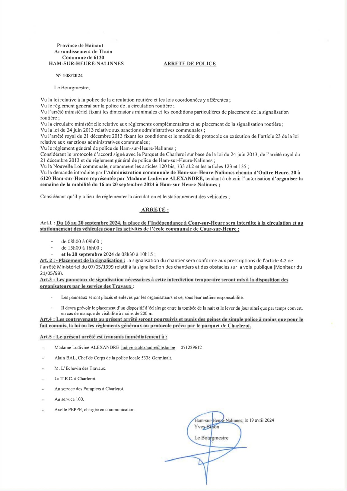 Arrêté de police place de l'Indépendance à Cour-sur-Heure