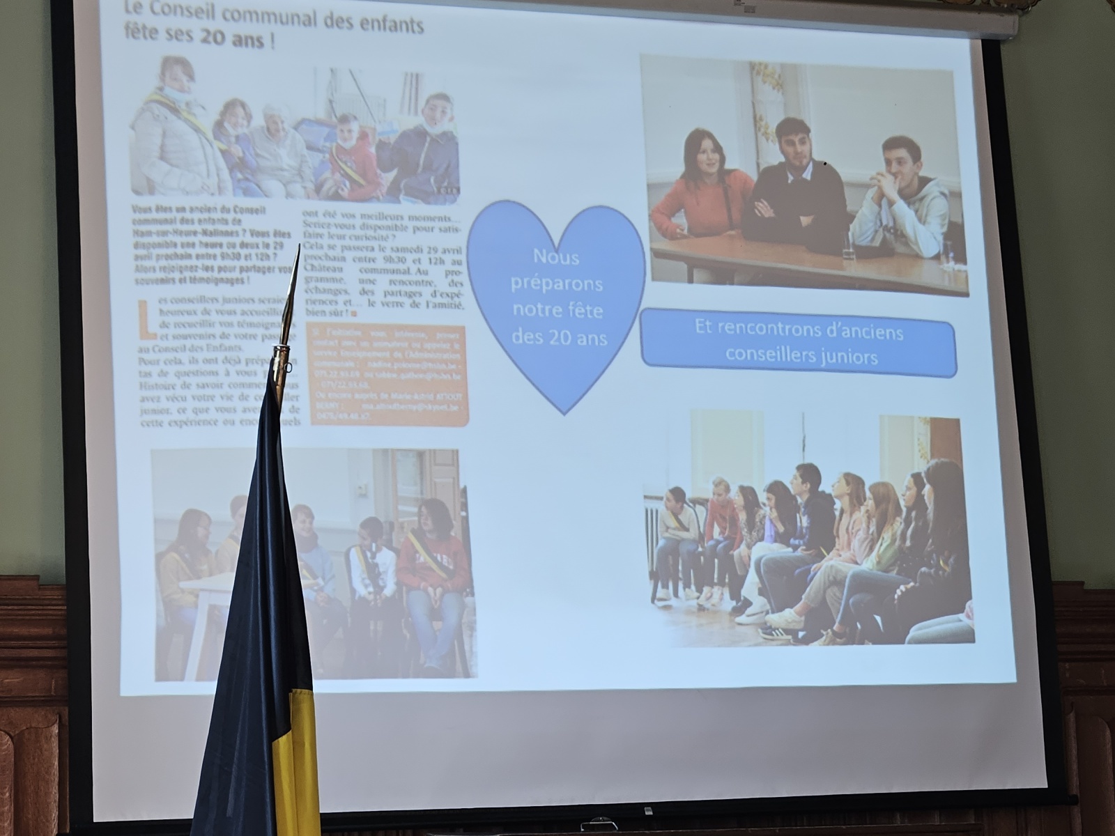 "Des récits, élaborés par les enfnats et juste corrigés par les accompagnateurs adultes", comme l'a précisé Marie-Astrid attout-Berny, l'échevine en charge du CCE, soutenus par une présentation en photos d'une année riche en émotions et qui a débuté par les élections pour se terminer par cette dernière séance en passant par les commémorations, les visites dans les maisons de repos, la Bénédictions Saint-Hubert ou encore la remise des mérites culturels et sportifs de la Commune.