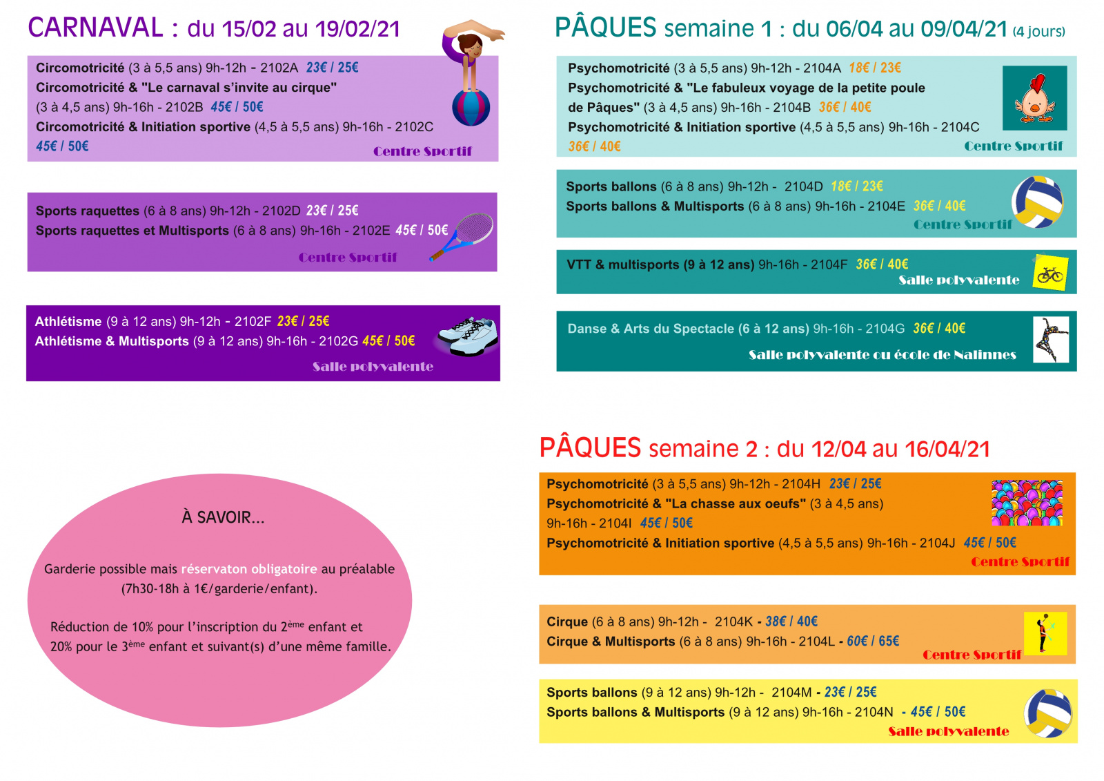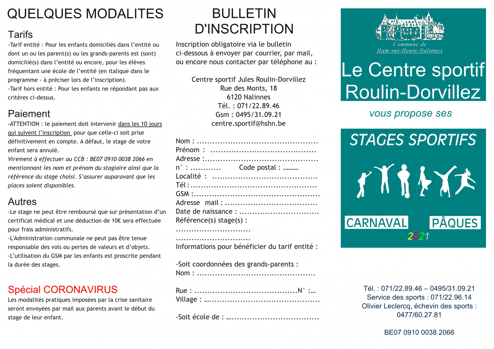 Voici la proposition de stages organisés au Centre sportif Jules Roulin-Dorvilez à Nalinnes durant les vacances de Carnaval et de Pâques :