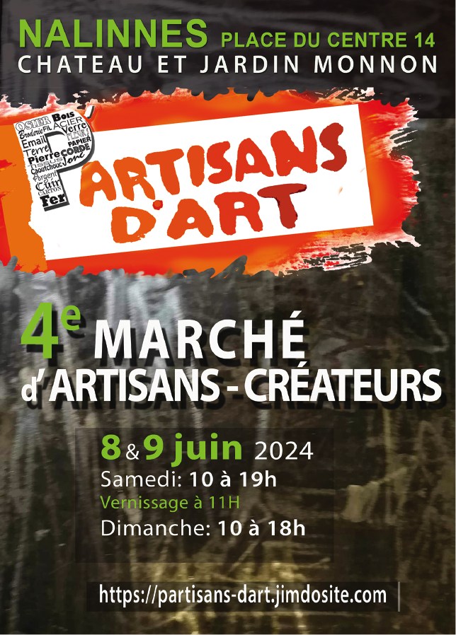 Les P'Artisans d'Art d'Ham-sur-Heure-Nalinnes organisent, les 8 et 9 juin prochains, leur 4ème Marché Artisanal. Une trentaine d'artisans, soigneusement sélectionnés, montreront leur savoir-faire et exposeront à la vente leurs œuvres, dans le cadre du Château Monnom à Nalinnes Centre.