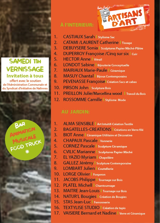 Les P'Artisans d'Art sont heureux de vous inviter au vernissage de cet événement culturel et au vin d'honneur qui suivra, animé par la Fanfare Royale Communale de Nalinnes. Ils vous accueilleront pour cela le samedi 8 juin à 11h00.