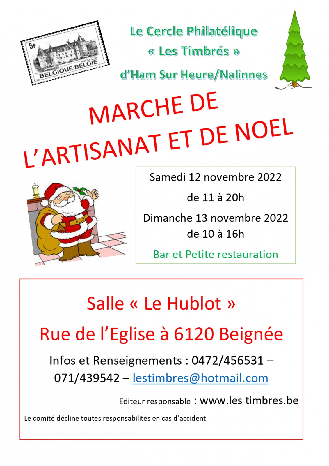 Le Cercle Philatélique « Les Timbrés » de Ham-sur-Heure-Nalinnes organise son 14e Marché de l'artisanant et de Noël en la salle "Léon Tourneur Le Hublot" à Beignée.