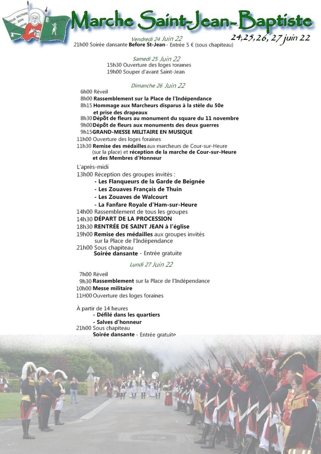 Voici l'horaire des festivités de la Marche Saint-Jean Baptiste de Cour-sur-Heure, la première des six marches qui se dérouleront dans notre entité cette année.