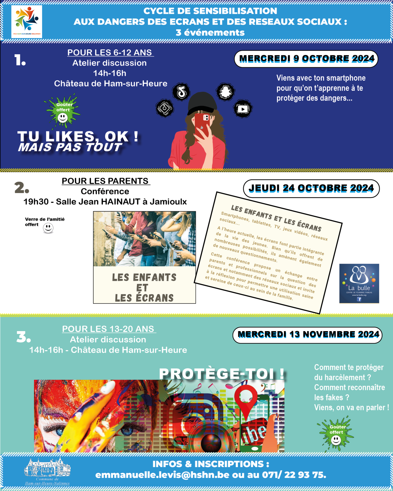 Le Plan de Cohésion Sociale et la Bulle proposent un cycle de trois événements consacrés à la sensibilisation aux dangers des écrans et des réseaux sociaux. Les publics visés par ces activités sont différents : les jeunes ados, les parents et les grands adolescents.