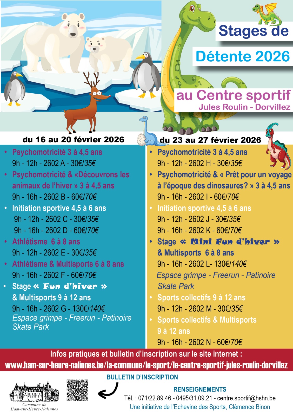 Voici le programme de la prochaine période de stages organisés par les équipes du centre sportif :