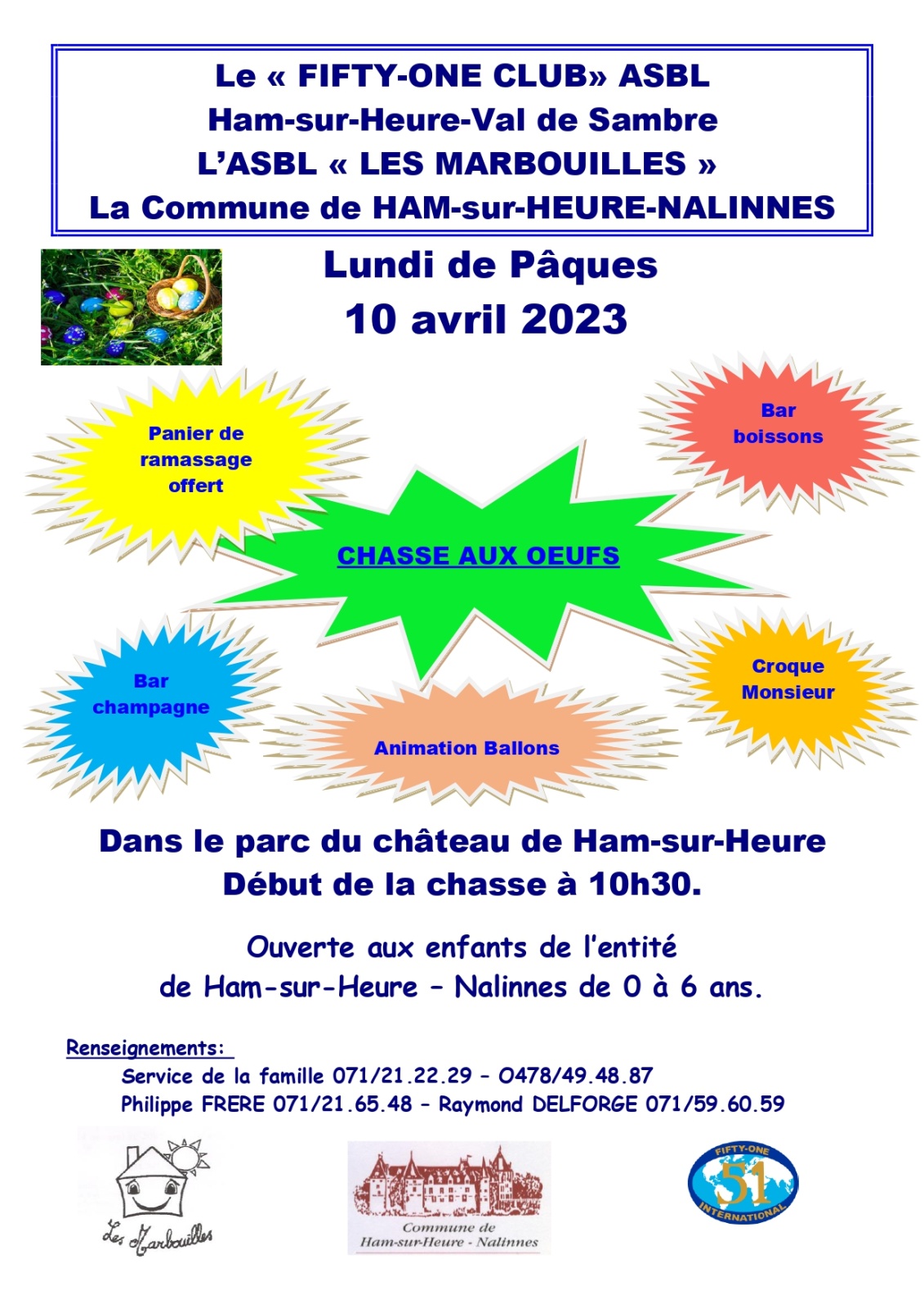 Le Fifty-One Club de Ham-sur-Heure, l’ASBL « Les Marbouilles » et l’Administration communale de Ham-sur-Heure-Nalinnes ont le plaisir de vous inviter le lundi 10 avril 2023 (lundi de Pâques) à la traditionnelle chasse aux œufs. Celle-ci est ouverte aux enfants de l’entité âgés de 0 à 6 ans et se déroulera dans le parc du Château de Ham-sur-Heure à partir de 10h30.