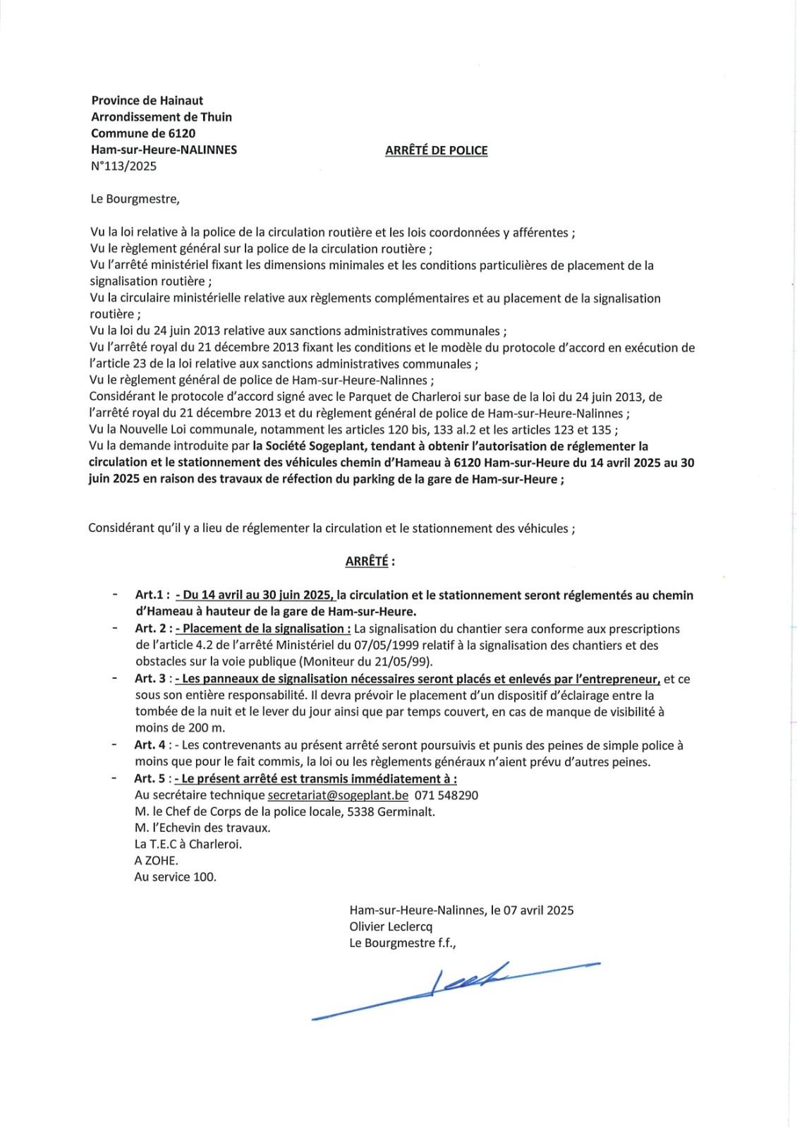 Veuillez prendre connaissance de l'arrêté de police suivant :