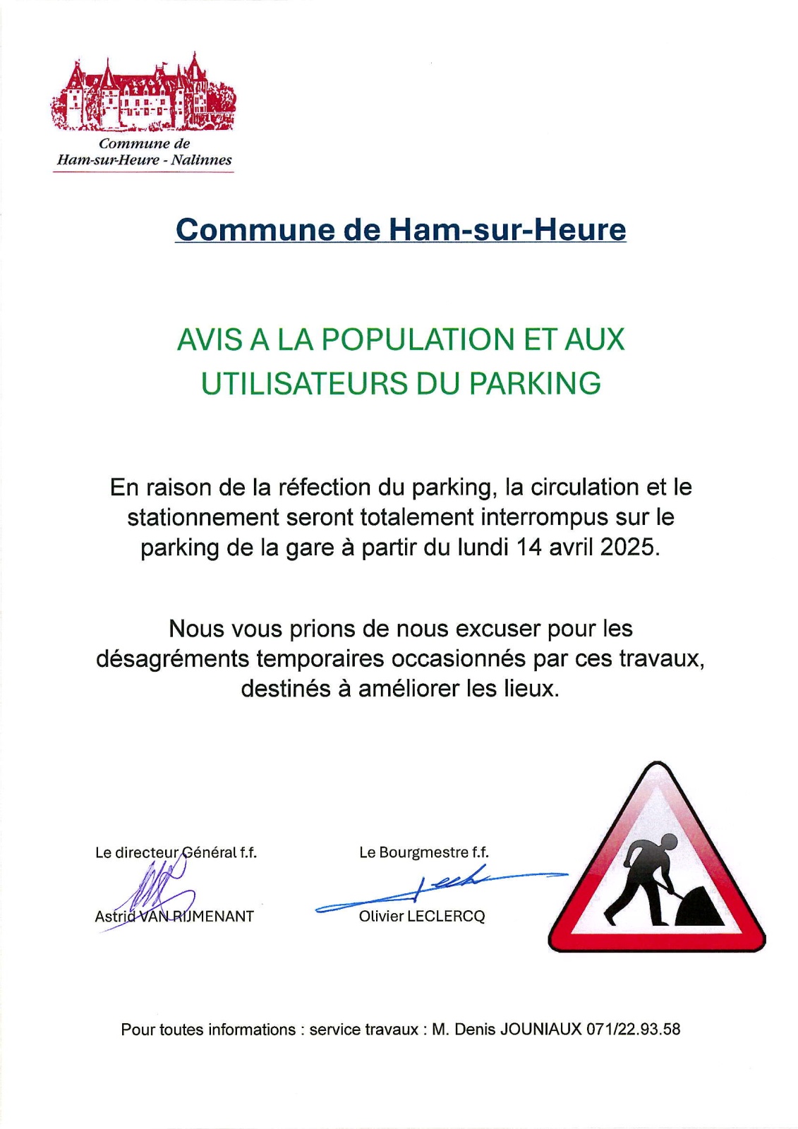 ATTENTION : à partir du lundi 14 avril 2025, le parking de la gare de Ham-sur-Heure sera en rénovation et donc inutilisable. Prenez vos précautions !