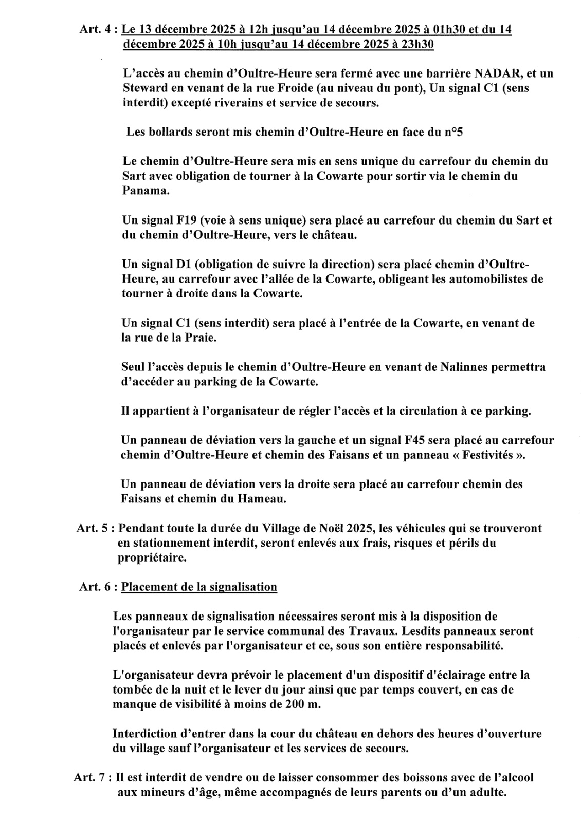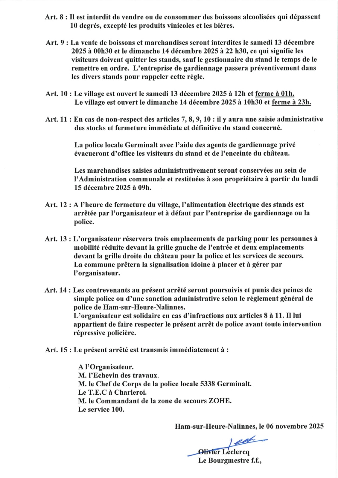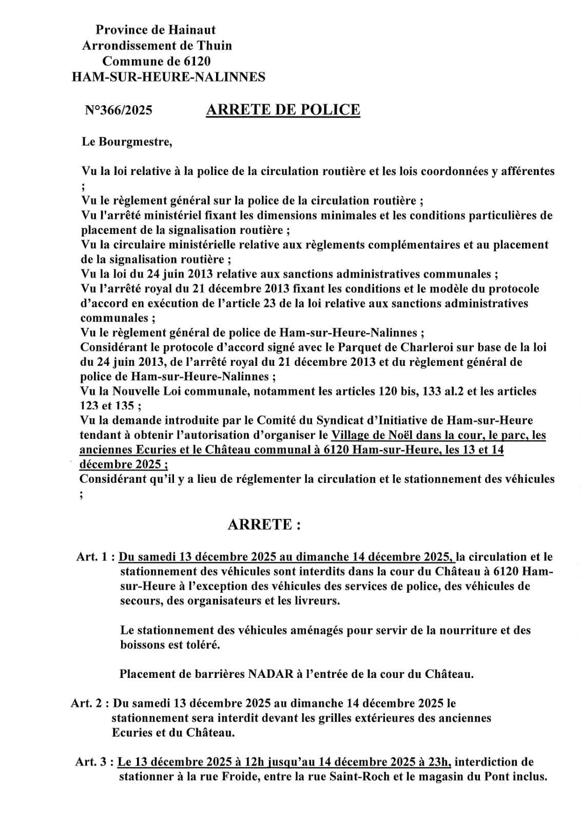 Arrêté de police relatif au Village de Noël de Ham-sur-Heure des 13 et 14 décembre 2025