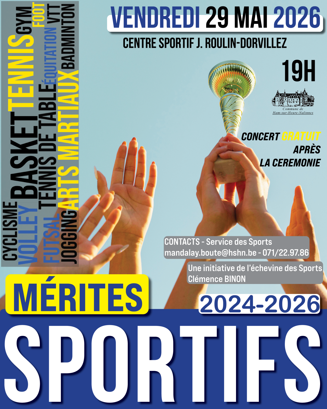 Notez déjà dans votre agenda que la cérémonie de remise des Mérites sportifs se déroulera le vendredi 29 mai 2026 à 19h au Centre sportif Jules ROULIN-DORVILLEZ à Nalinnes.