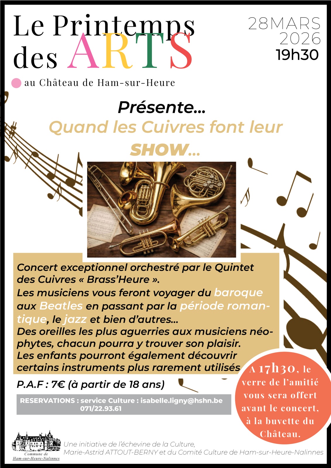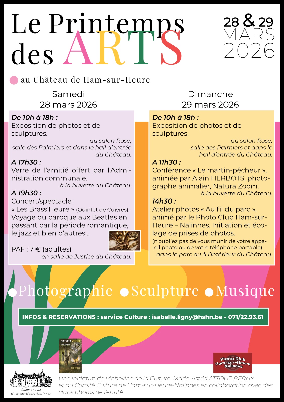 1. Le « Printemps des Arts » 2026 les 28 et 29 mars prochains qui mettra à l’honneur la photographie, la sculpture et la musique. C’est le concert du Quintet de Cuivres, Brass’Heure qui a été le point de départ d’un week-end de festivités culturelles. Agrémentée par une collaboration inédite avec les clubs photos de l’entité mais aussi des particuliers voulant faire partager leur passion, la proposition se complète avec une exposition (photos et sculptures) et une conférence sur le thème de la photographie animalière.